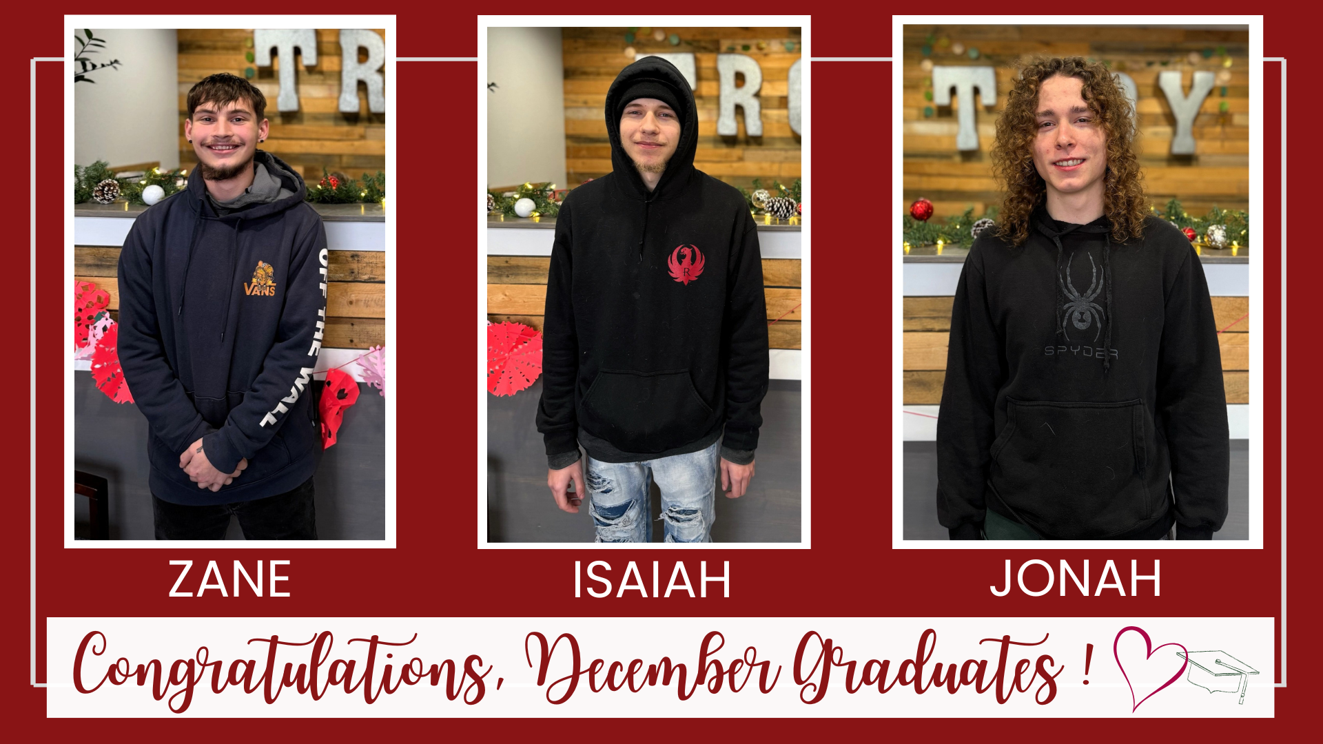 As we step into a new semester full of hope and opportunity for our students, we can’t help but take a moment to celebrate our early graduates. Zane Greene, Jonah Stucker, and Isaiah McCoy have all completed their credits and officially graduated at the end of December. We couldn’t be prouder of these incredible young men, though, we must admit—it’s a bit bittersweet knowing they won’t be walking the halls with us anymore.