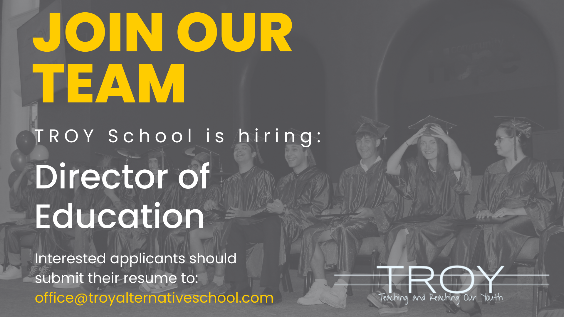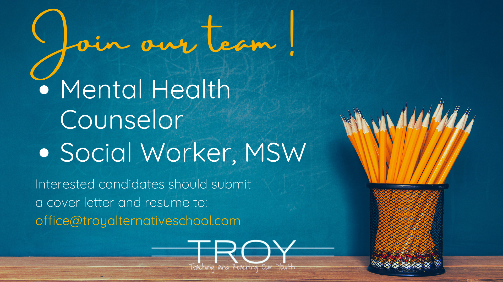 TROY School is HIRING and YOU could be the perfect fit for our growing team! If you desire to make a difference in the lives of young people, we would love to talk with you about this opportunity! All interested candidates should submit cover letter and resume to: office@troyalternativeschool.com